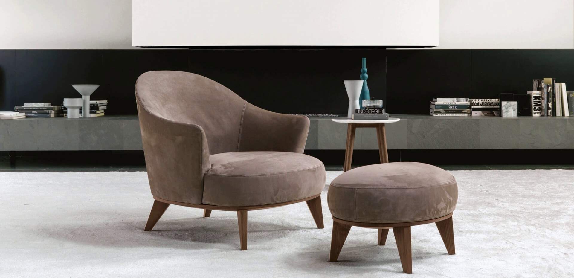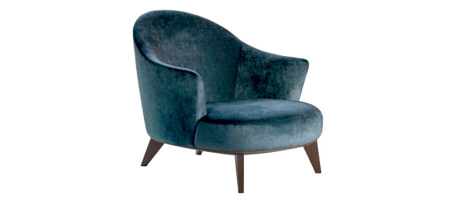 Alasia je elegantna, dobro izbalansirana fotelja sa zakrivljenim naslonom integrisanim sa naslonima za ruke i stilskom drvenom osnovom.