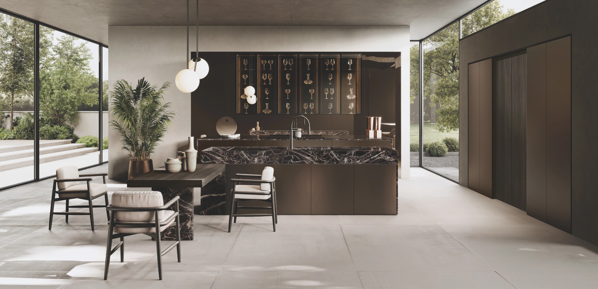Bluna Tech Alluminio Brunito stubovi stoje pored udubljenih Bluna Legno Rovere Corteccia vrata, skrivajući više prostora unutra – prostore raznolike kao i emocije, performanse i funkcije koje definišu kuhinjsko okruženje.