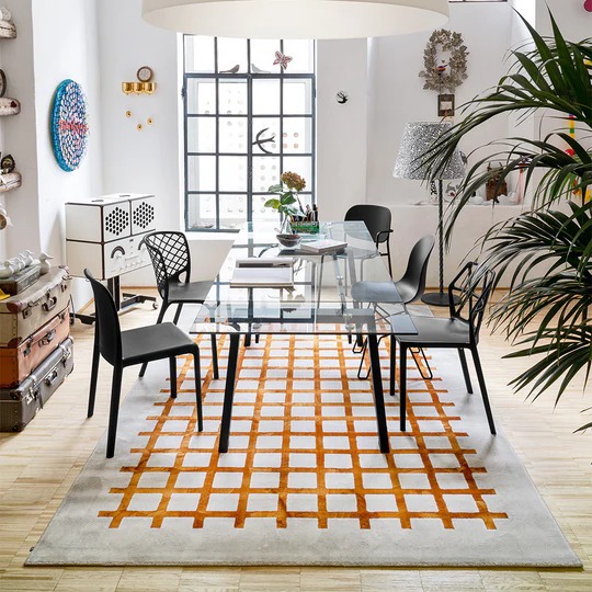 Mreža jednostavnih upravnih linija stvara karirani uzorak i vizuelno prijatnu estetiku koja definiše prostoriju.