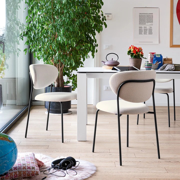 Udobno sedište sa jastučićima i naslon koji obuhvata leđa presvučen tkaninom, nalazi se na obojenoj metalnoj osnovi.