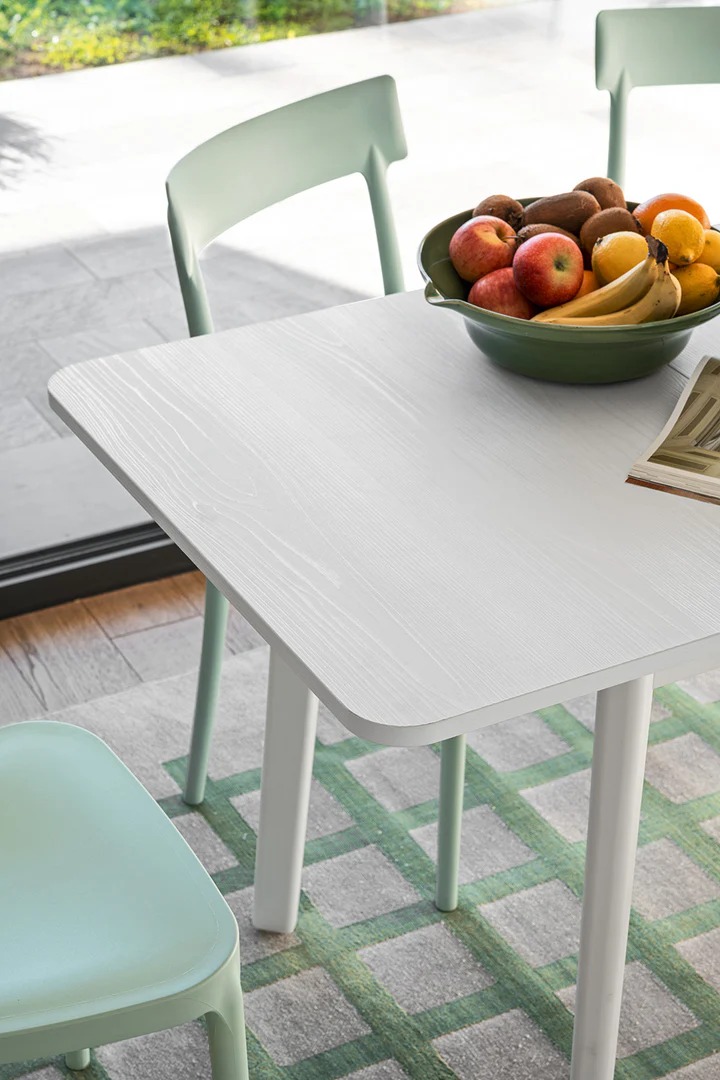 Dine je sto na razvlačenje i odlikuje se jednostavnim, elegantnim dizajnom, sa blago zaobljenim nogama i donjom strukturom lakiranom poput kutije.