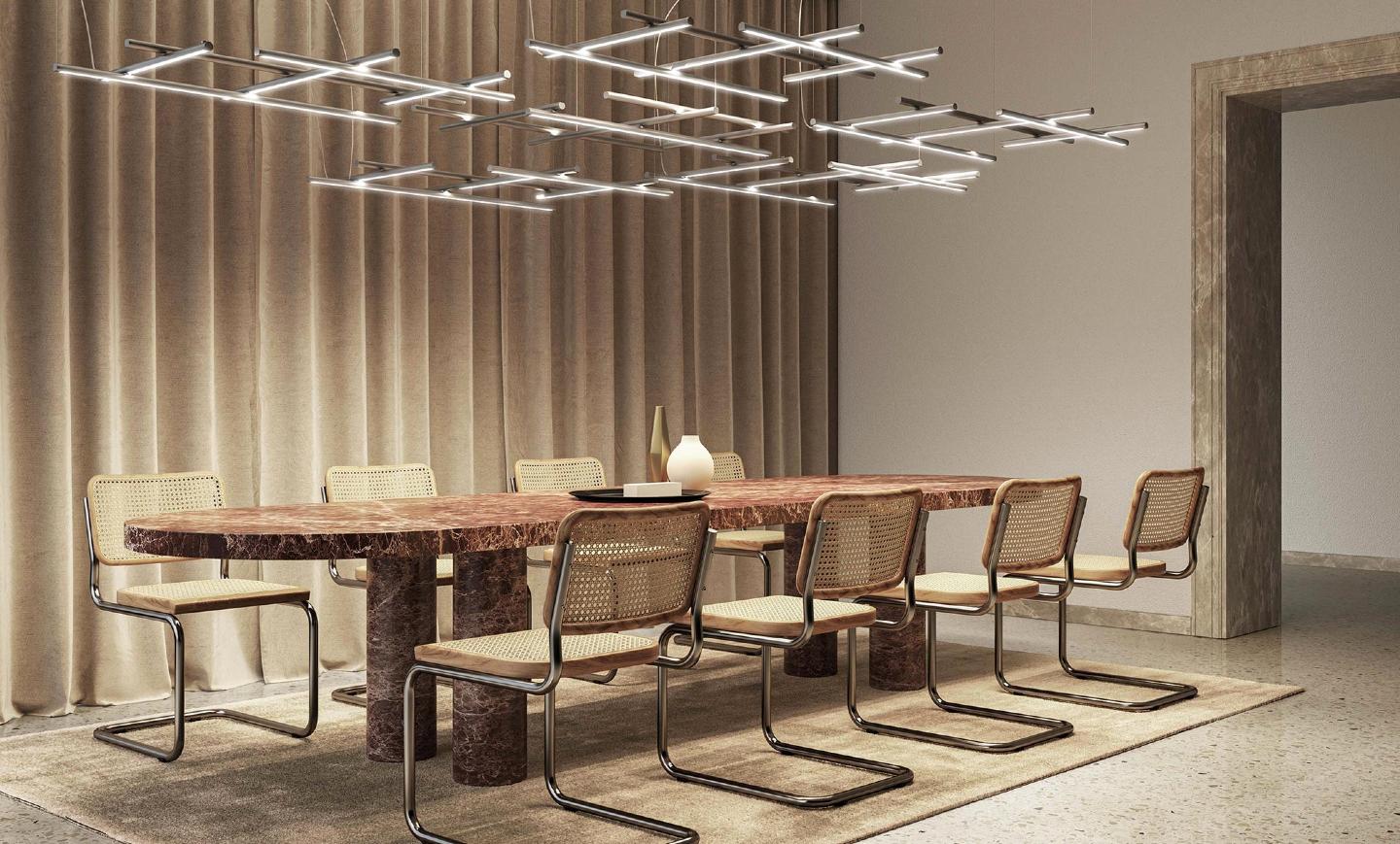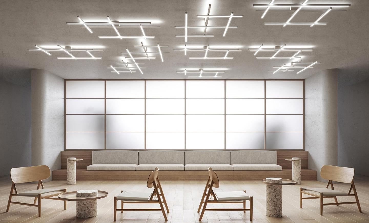 Rasveta napravljena od kombinacije linearnih uzdužnih elemenata, omogućavajući karakterizaciju svakog unutrašnjeg prostora svojim beskrajnim mogućnostima konfiguracije.