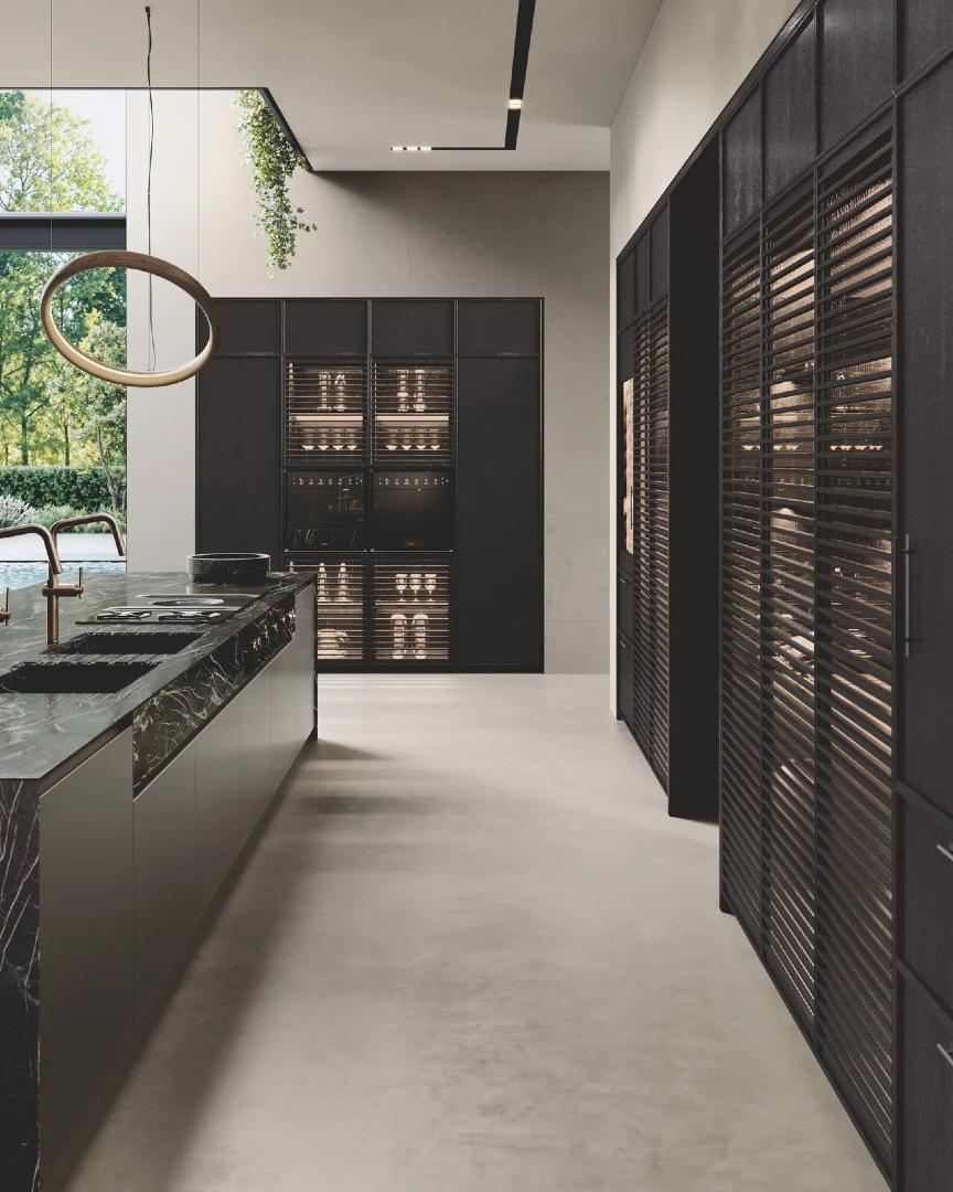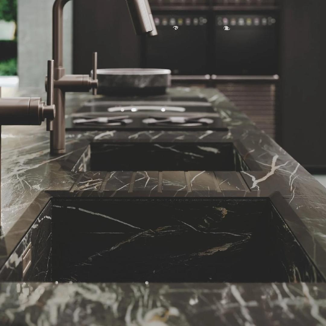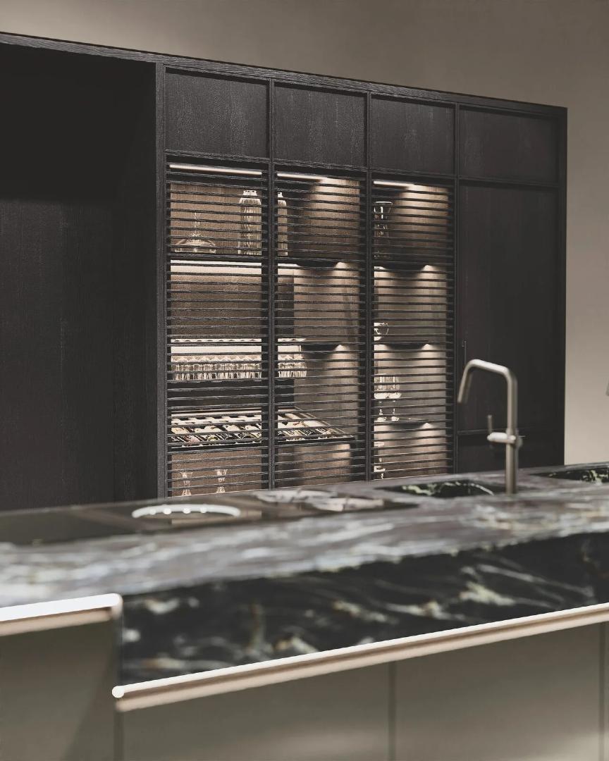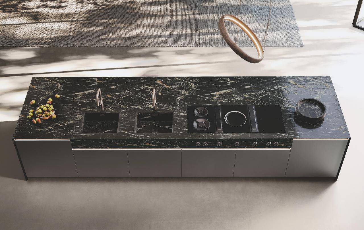 Bluna ostrvo, pozorište ukusa i funkcionalna duša kuhinjskog prostora, karakteriše prefinjeni susret između crne pozadine ploče i monoblok poklopca od prirodnog kamena, zajedno sa metalnom elegancijom vrata u boji Dakhia beige.