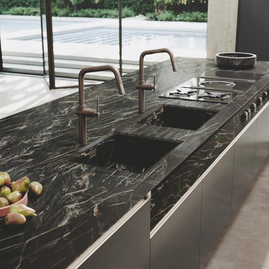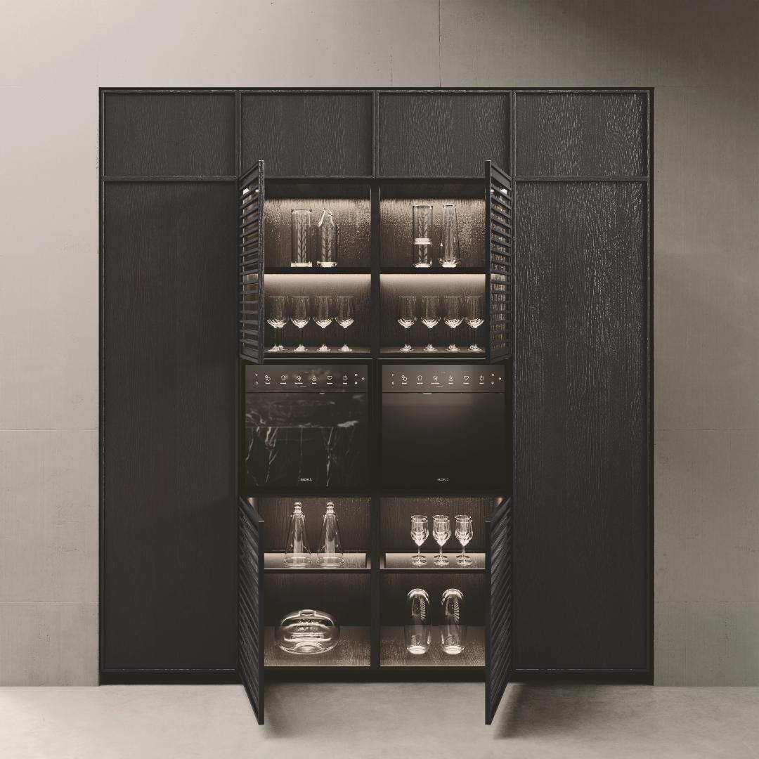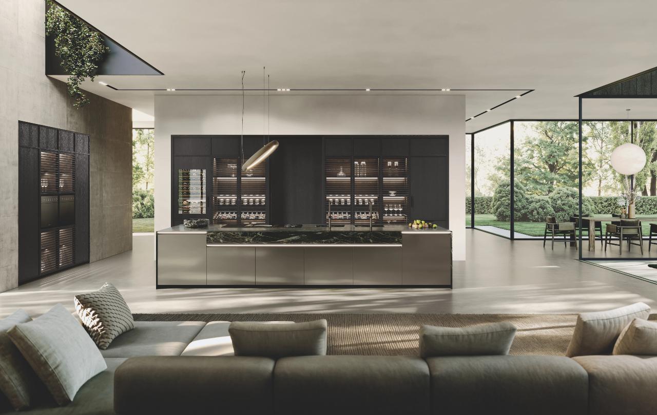 Bluna ostrvo, pozorište ukusa i funkcionalna duša kuhinjskog prostora, karakteriše prefinjeni susret između crne pozadine ploče i monoblok poklopca od prirodnog kamena, zajedno sa metalnom elegancijom vrata u boji Dakhia beige.