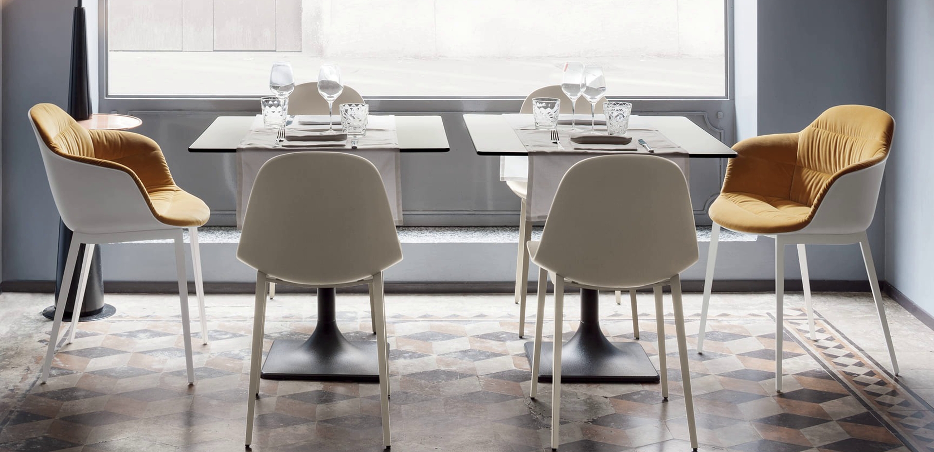 Sedište i naslon od polipropilena a školjka tapacirana i pokrivena.