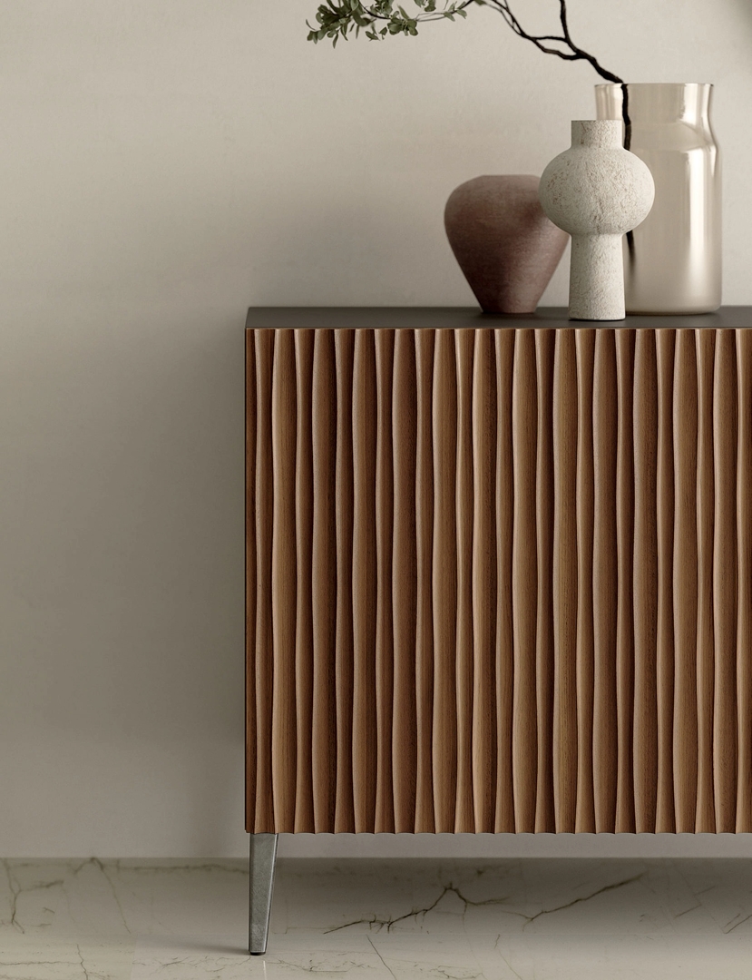 Komoda sa drvenim okvirom i unutrašnjim policama od prozirnog stakla.