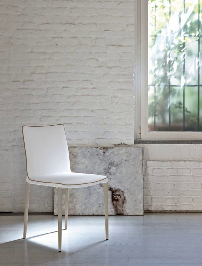 Stolica postavljena i potpuno tapacirana sa nogama u lakiranom metalnom okviru, cevi mogu biti u odgovarajućoj ili kontrastnoj boji.