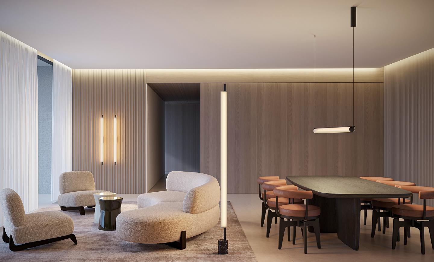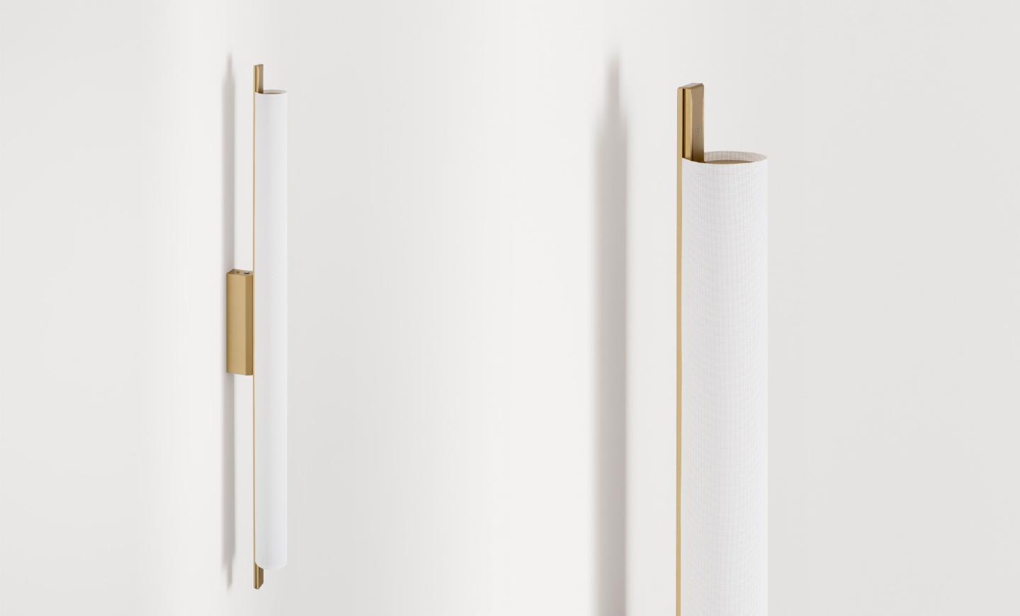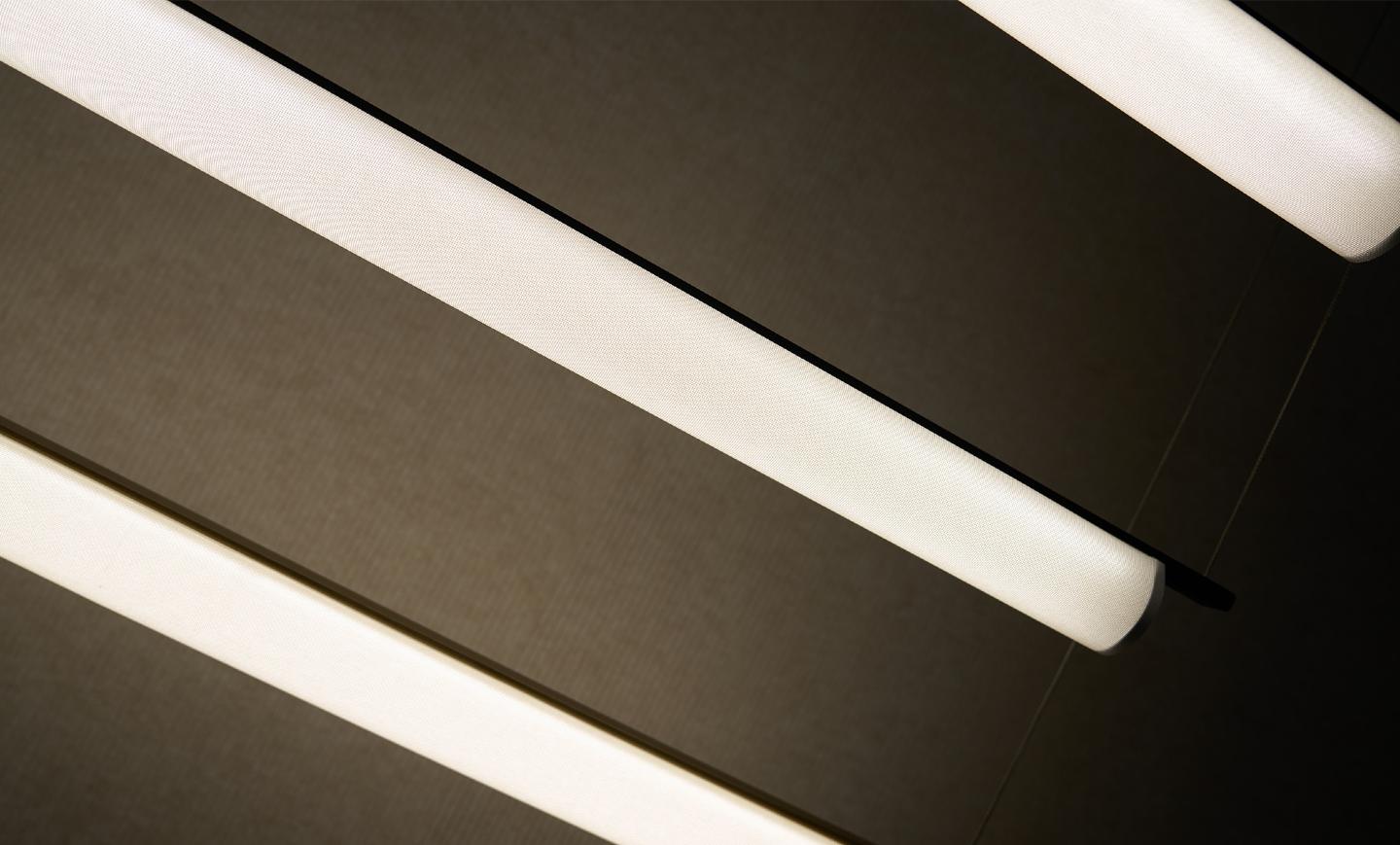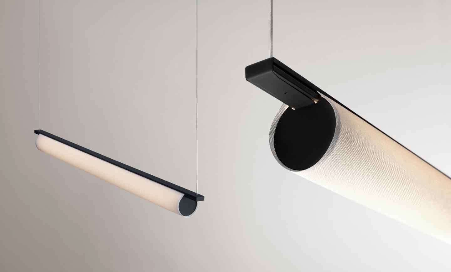Niz dekorativnih unutrašnjih svetiljki, uključujući viseće, zidne, stone i podne verzije, kod kojih je svetlost gotovo skrivena tehničkom tkaninom abažura, stvarajući sugestivne atmosfere.