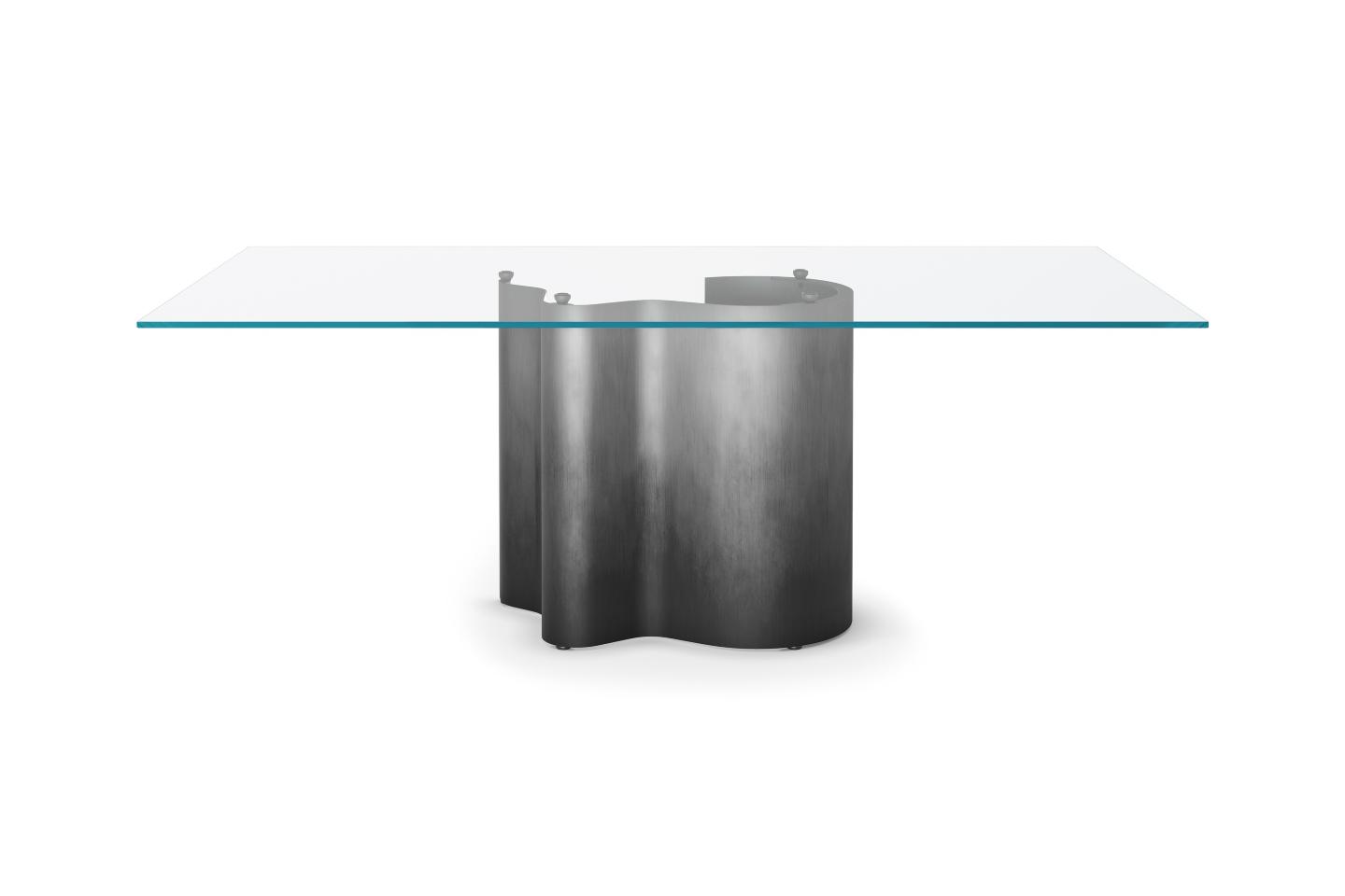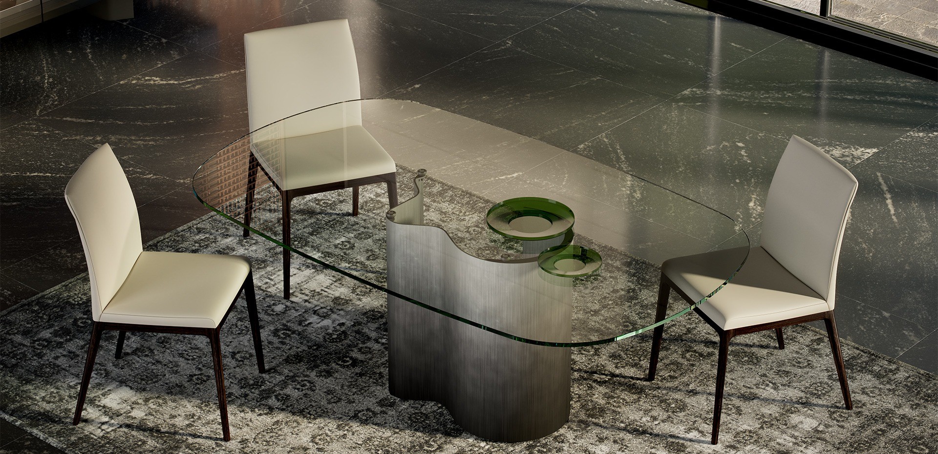 Zmijolika silueta ovog dizajnerskog staklenog stola može se ceniti u celosti.