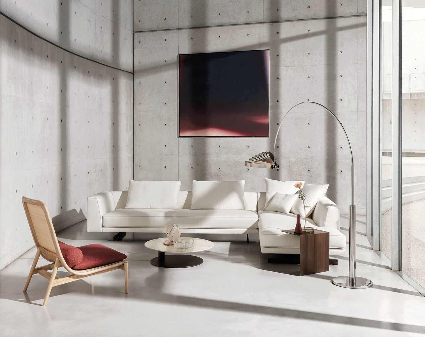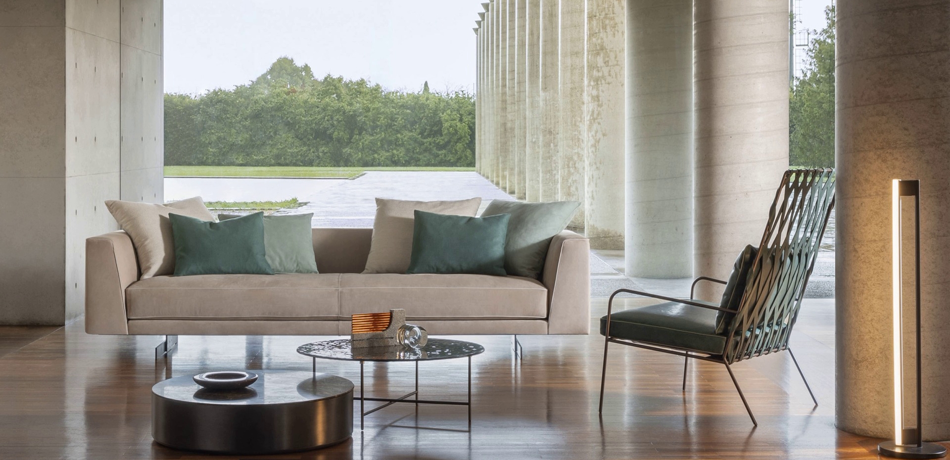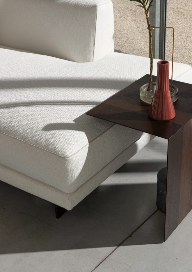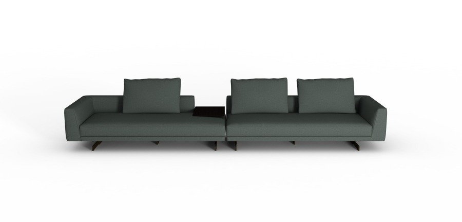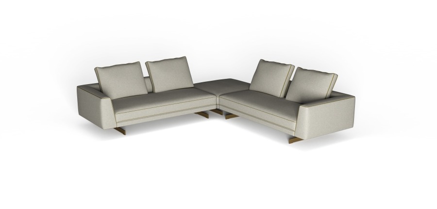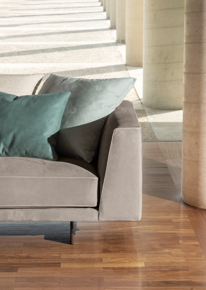 Sofa Sheridan se ističe svojim čistim i simetričnim linijama, širokim naslonima za ruke, elegantnim cevima koje se protežu duž njenih kontura i bronzanom metalnom osnovom koja ovom komadu tapaciranog nameštaja daje iskru sofisticiranog sjaja.
