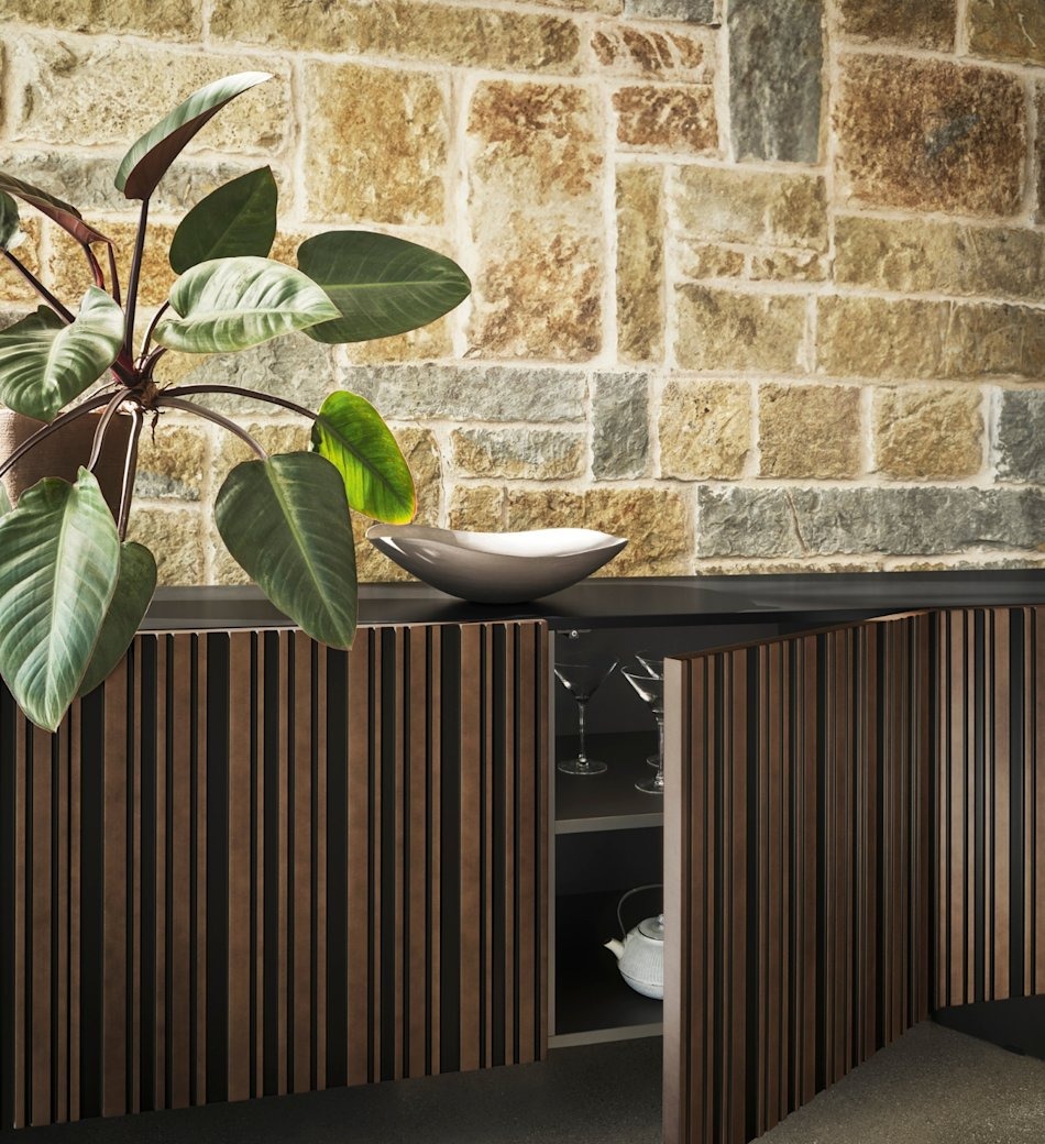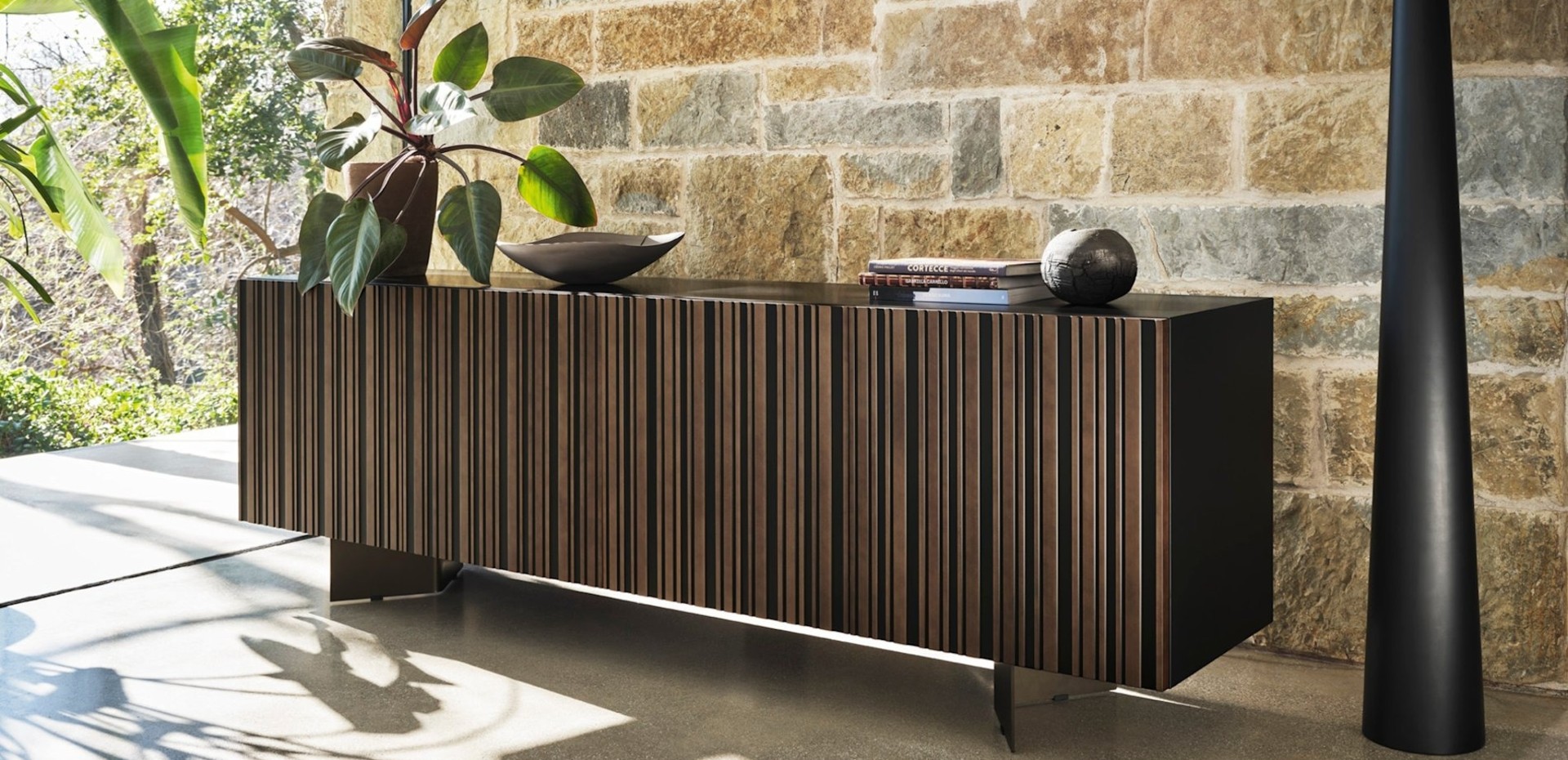 Završna obrada od brušene bronze stvara interakciju volumena i dubine koja ističe estetiku komode, čineći je centralnim delom u dnevnom boravku.