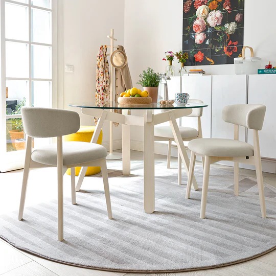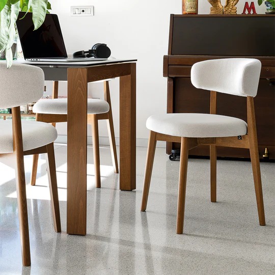 Drveni okvir elegantnog zaobljenog oblika savršeno se kombinuje sa mekim sedištem i postavljenim naslonom koji obavija leđa.
